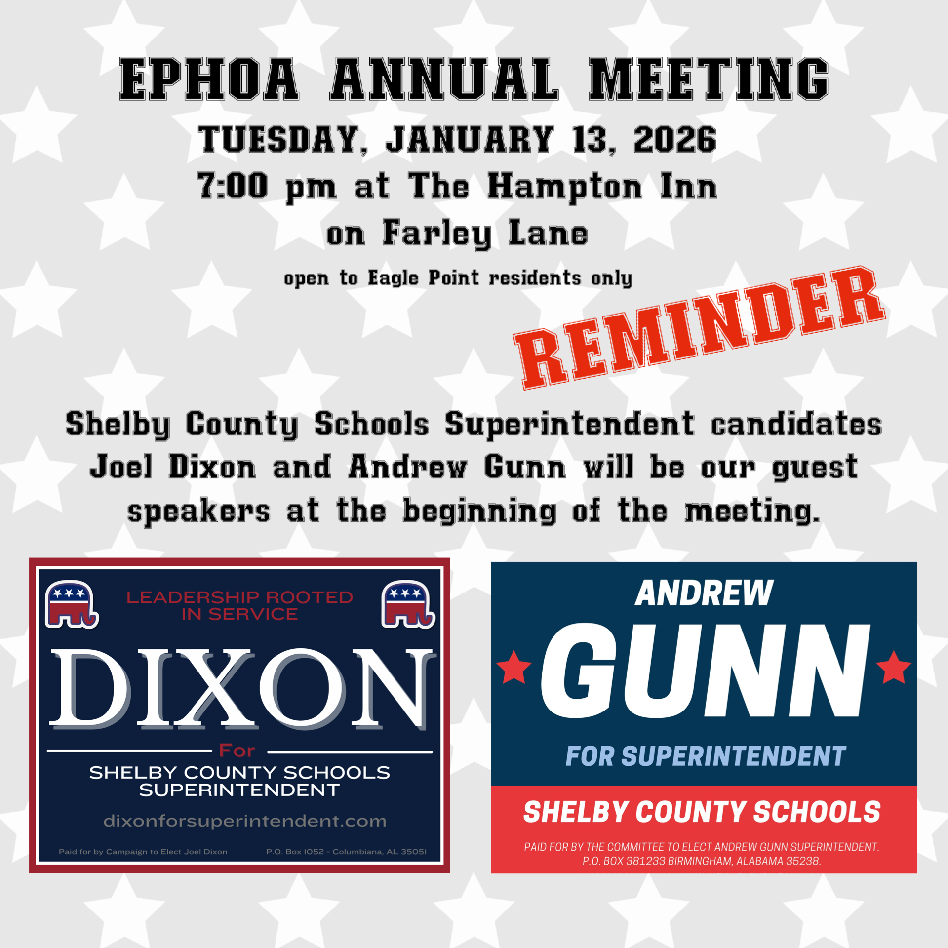The EPHOA Annual Meeting is scheduled for Tuesday, January 13th, at 7:00 pm at The Hampton Inn. This information was included in the annual dues letter and invoice that was sent to all homeowners in December.